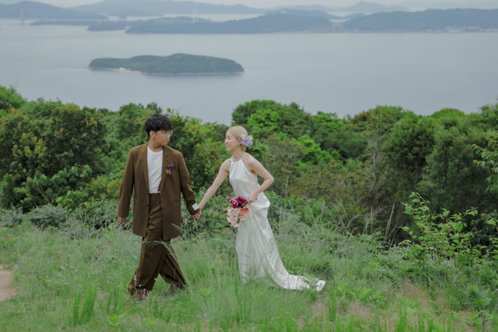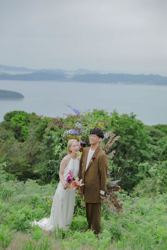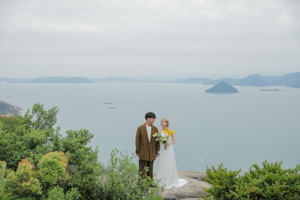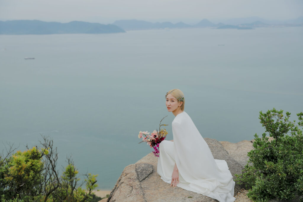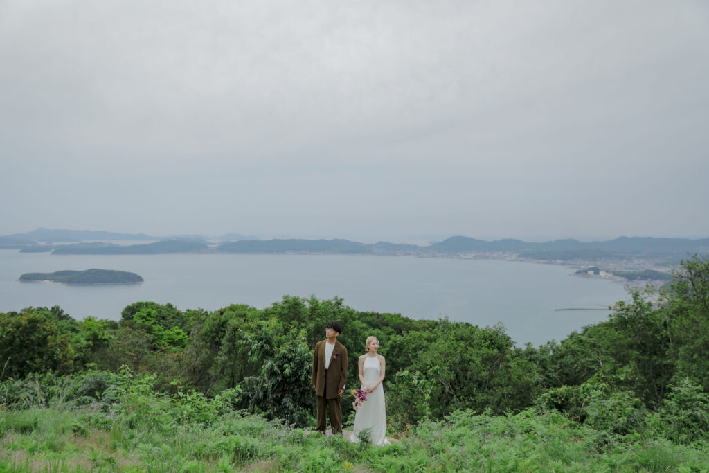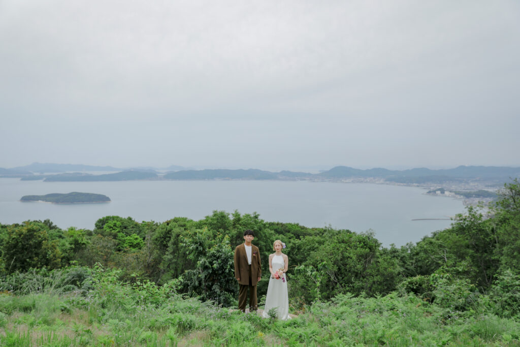 岡山県にある王子ヶ岳は、雄大な瀬戸内海を一望できる絶景の地。おふたりにとって思い出の場所であるこの場所で、新緑がまぶしい5月、特別なフォトウェディングが叶いました。