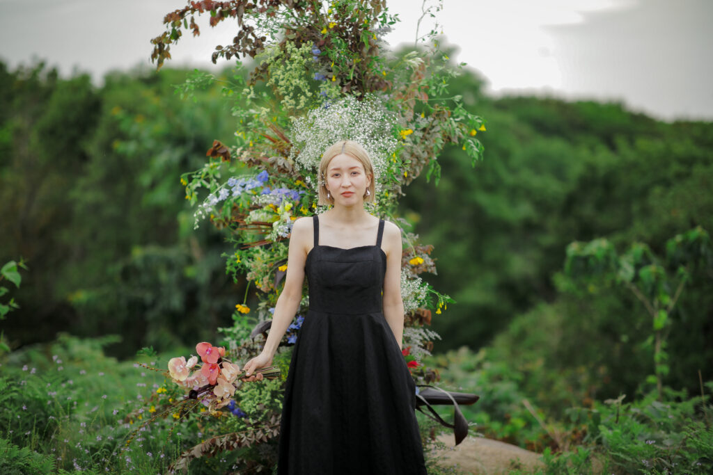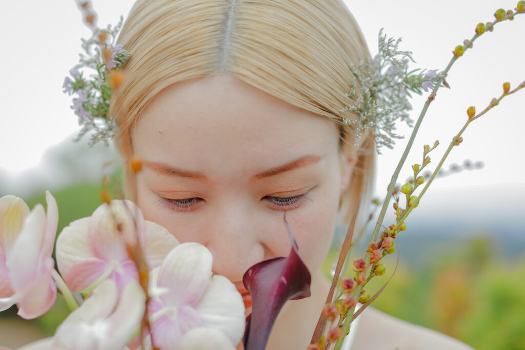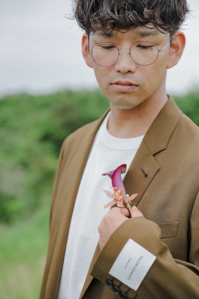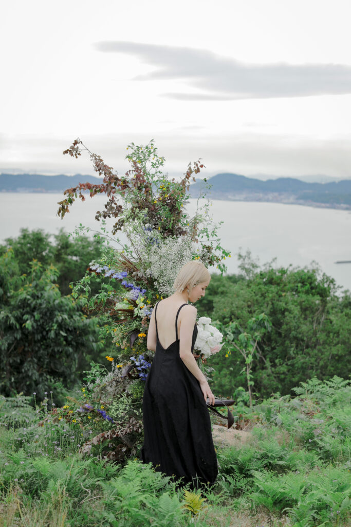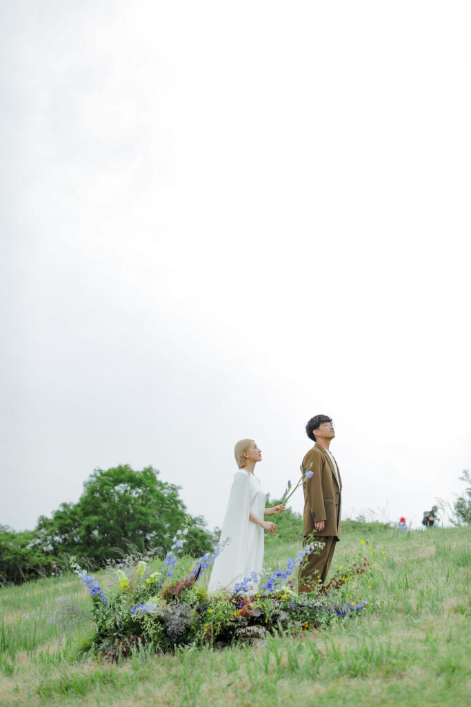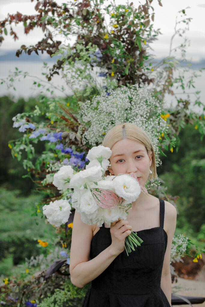 この日のために準備されたのは、生花をふんだんに使った特別な演出。おふたりが立つ場所に置かれた、大胆なお花のオブジェは、王子が岳の壮大な自然に溶け込み、まるでアート作品のよう。ブーケや髪飾りにも繊細な生花が使われ、新婦様の美しさを引き立てています。
