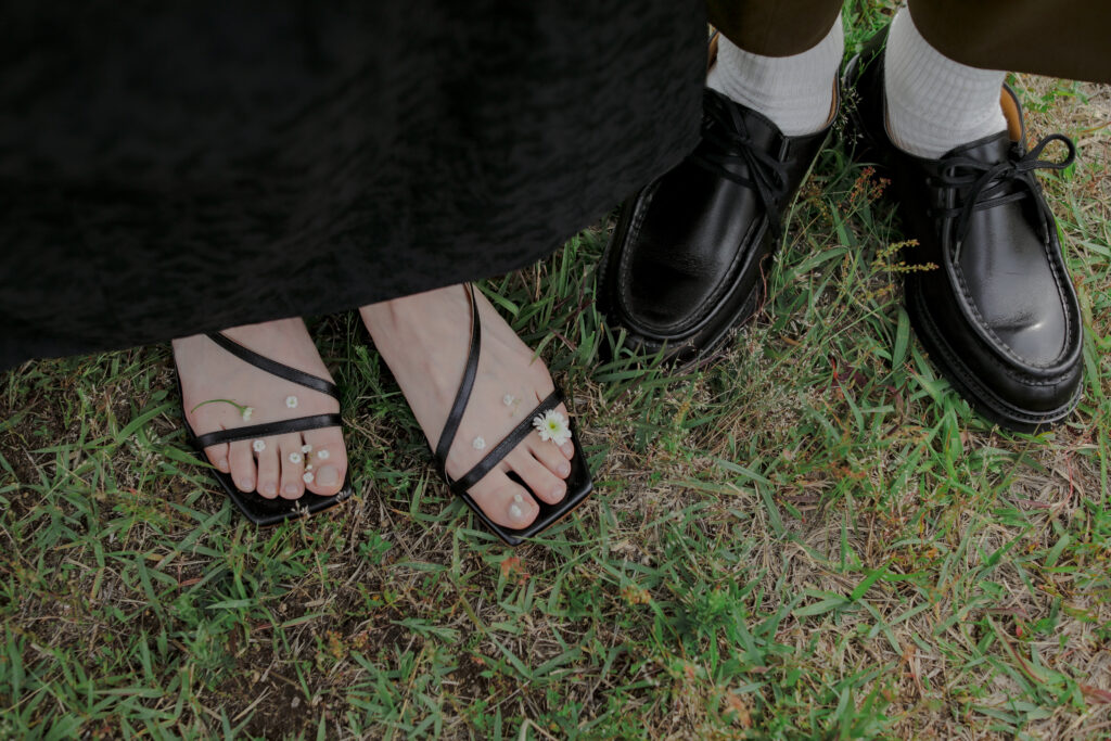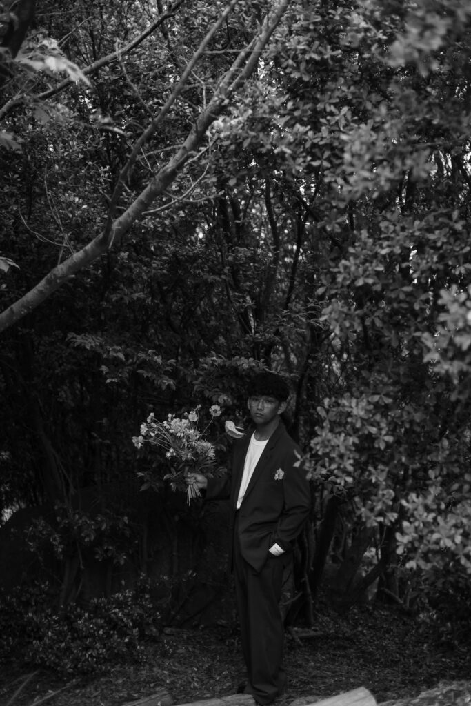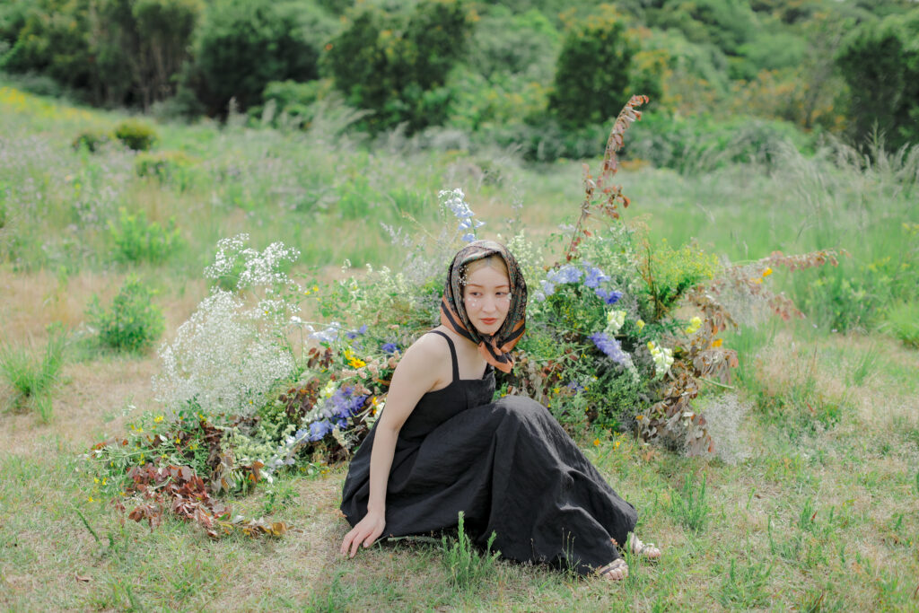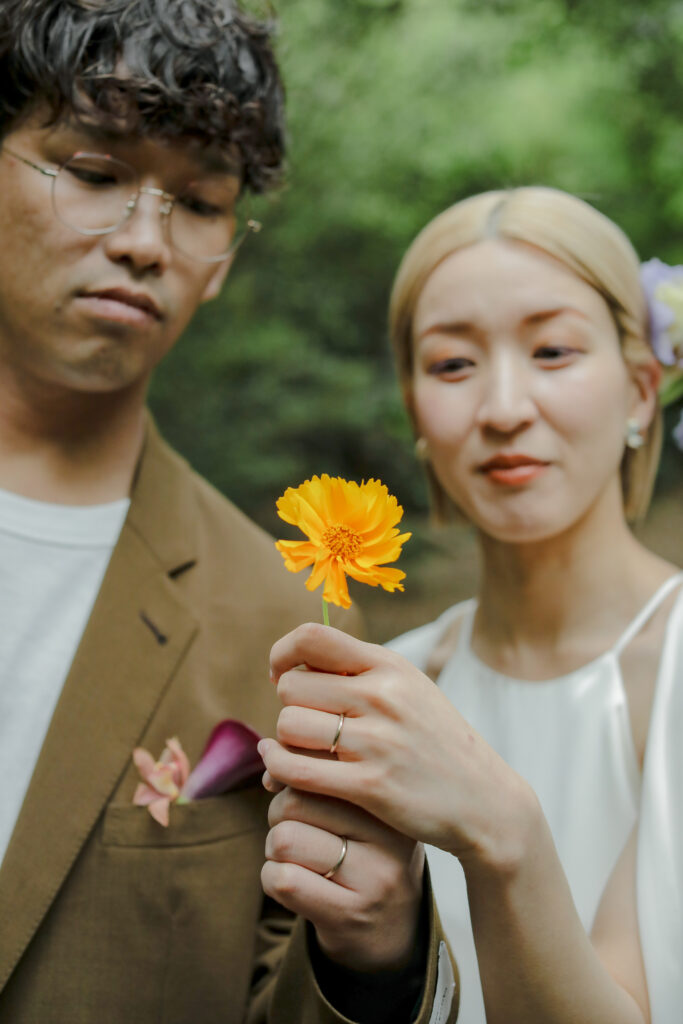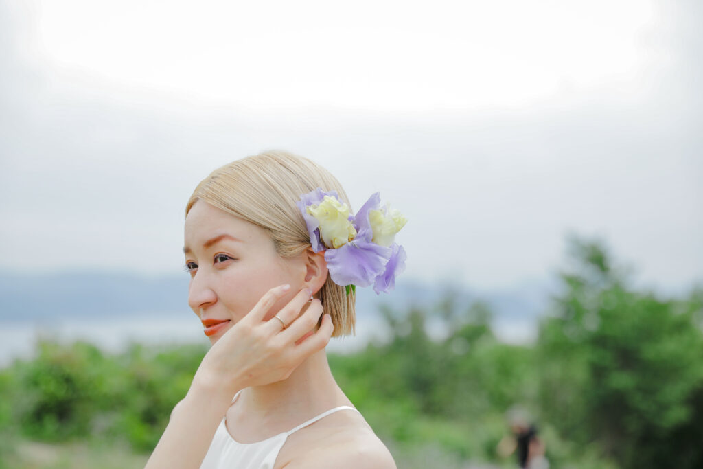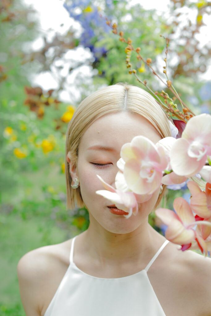 この日のために準備されたのは、生花をふんだんに使った特別な演出。おふたりが立つ場所に置かれた、大胆なお花のオブジェは、王子が岳の壮大な自然に溶け込み、まるでアート作品のよう。ブーケや髪飾りにも繊細な生花が使われ、新婦様の美しさを引き立てています。