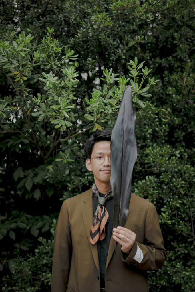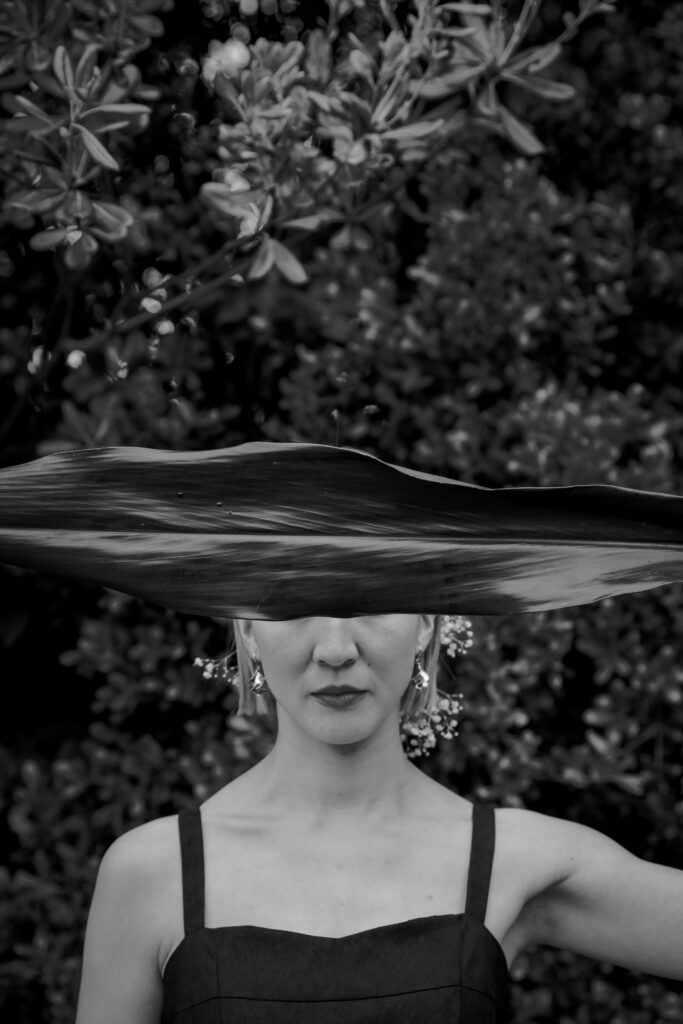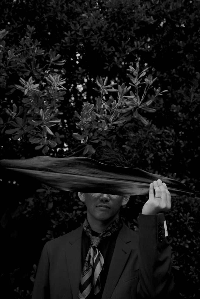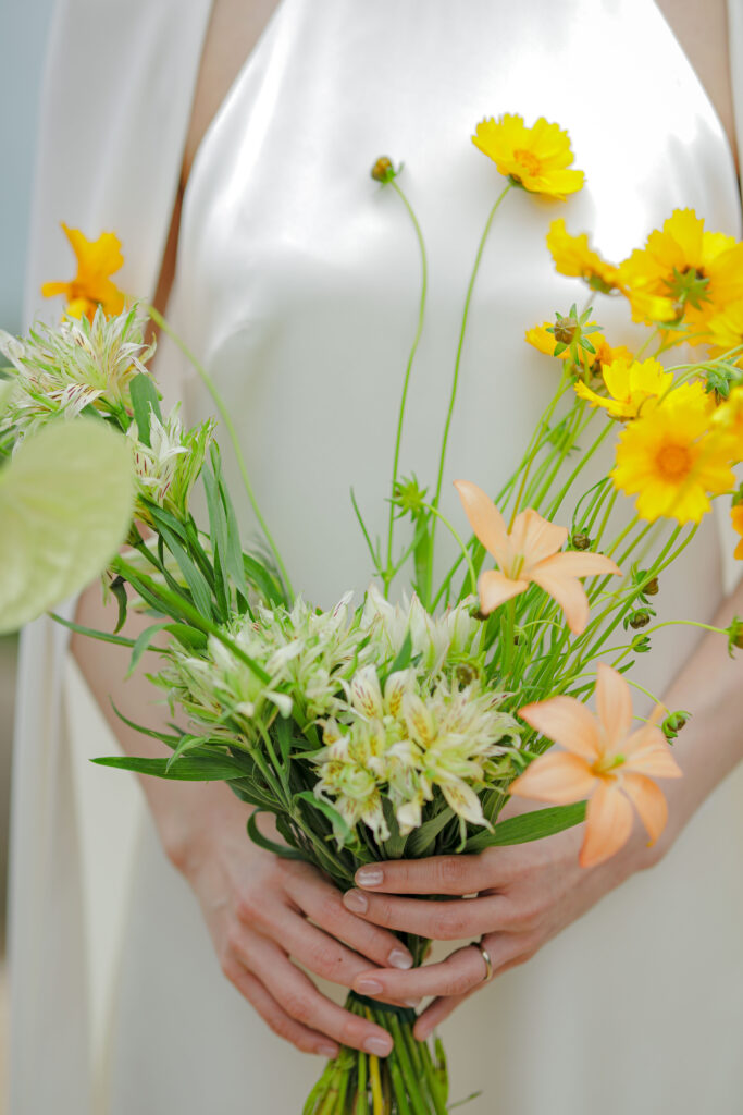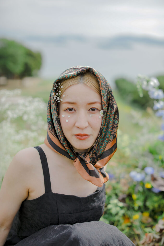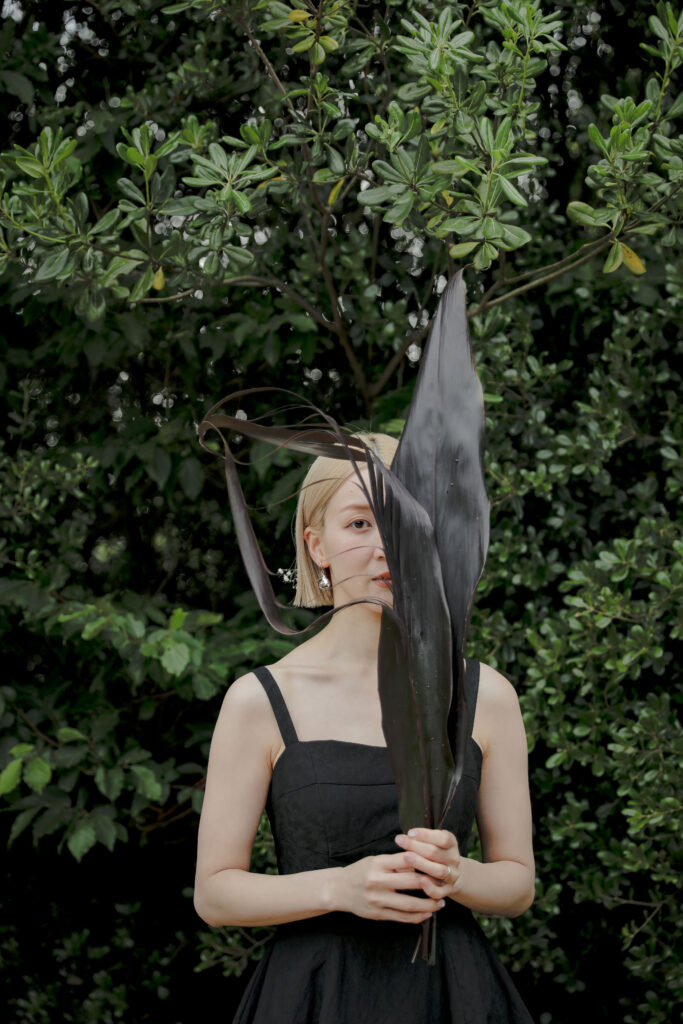 この日のために準備されたのは、生花をふんだんに使った特別な演出。おふたりが立つ場所に置かれた、大胆なお花のオブジェは、王子が岳の壮大な自然に溶け込み、まるでアート作品のよう。ブーケや髪飾りにも繊細な生花が使われ、新婦様の美しさを引き立てています。