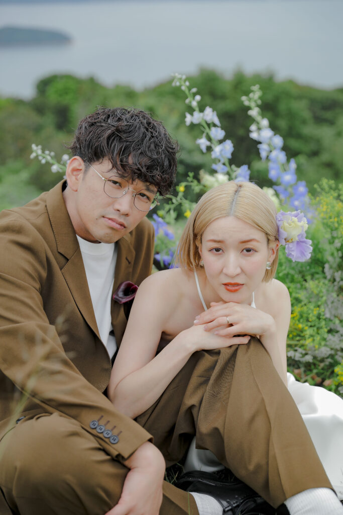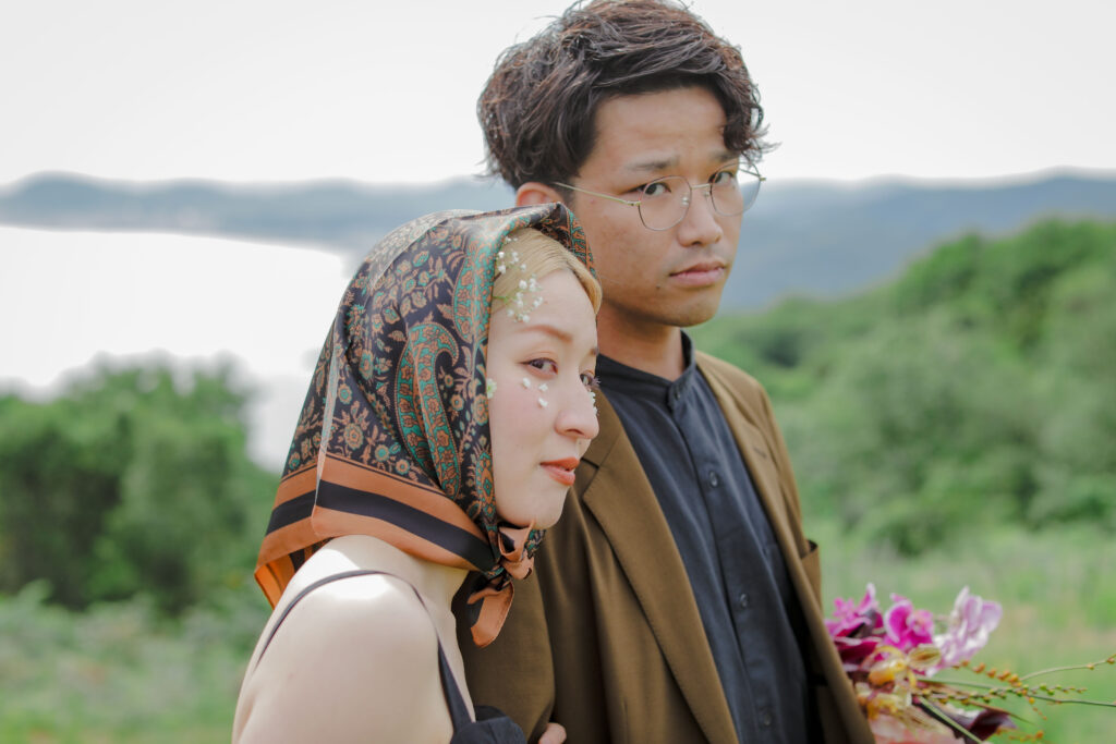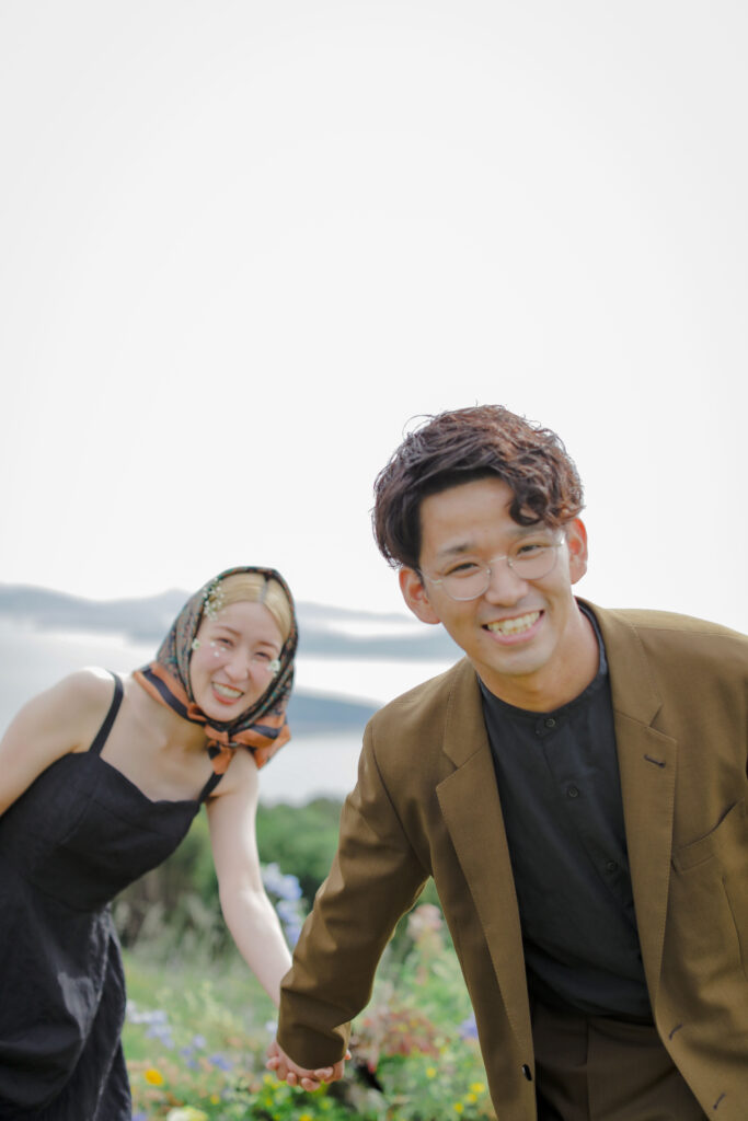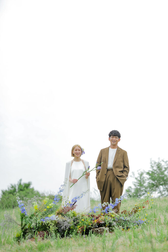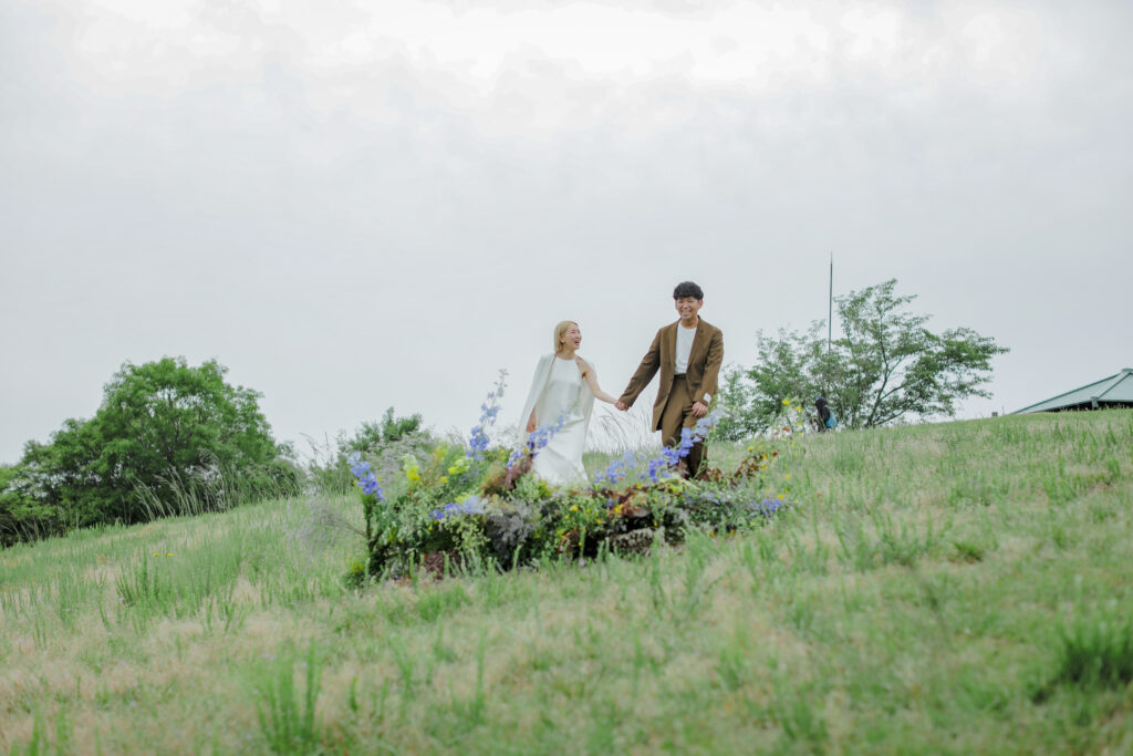 思い出の地である王子ヶ岳の景色と、美しい生花の魔法が一体となり、おふたりだけの特別なフォトウェディングが実現。ふたりが手を取り合い、見つめ合う姿。ときには少し照れくさそうに、でも幸せそうに笑う表情。全ての瞬間が、かけがえのない宝物となりました。
