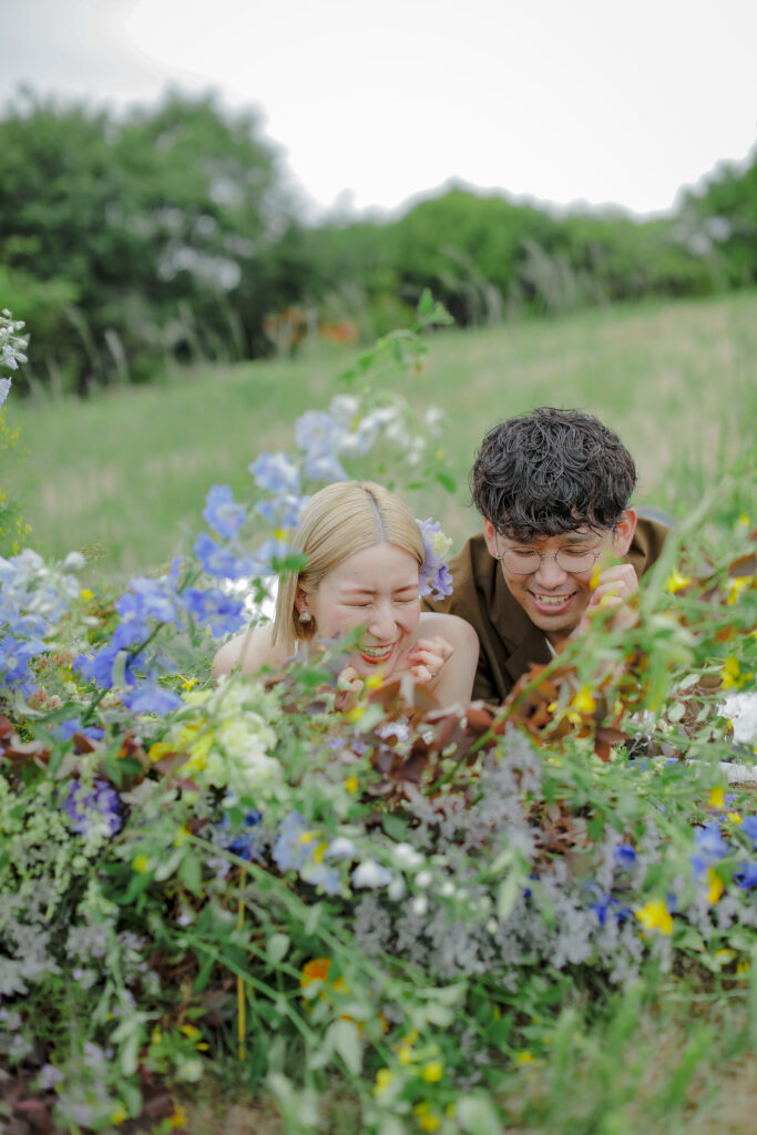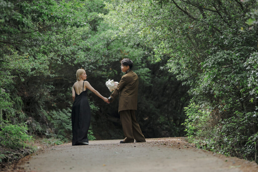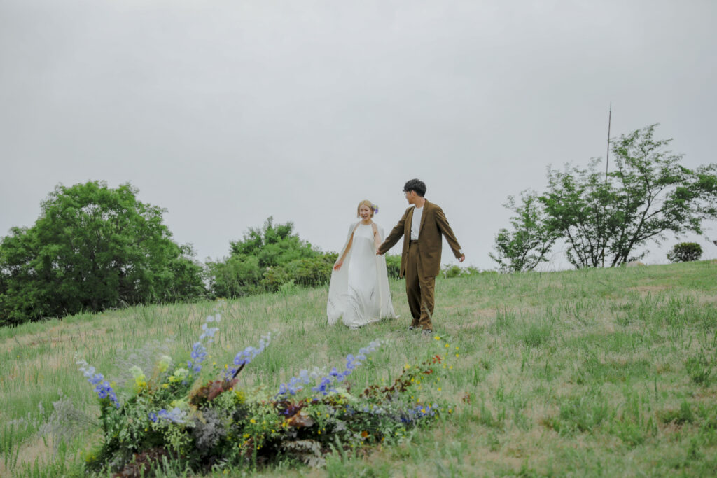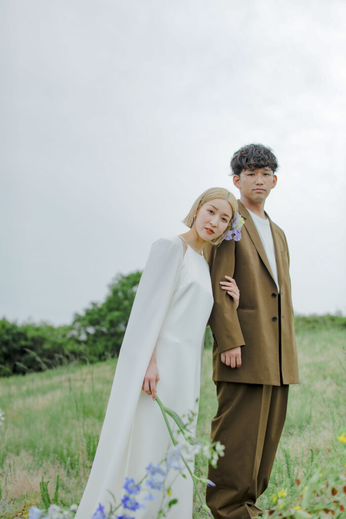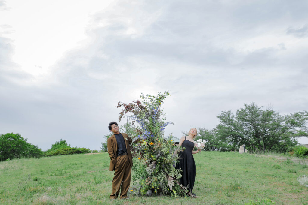 思い出の地である王子ヶ岳の景色と、美しい生花の魔法が一体となり、おふたりだけの特別なフォトウェディングが実現。ふたりが手を取り合い、見つめ合う姿。ときには少し照れくさそうに、でも幸せそうに笑う表情。全ての瞬間が、かけがえのない宝物となりました。