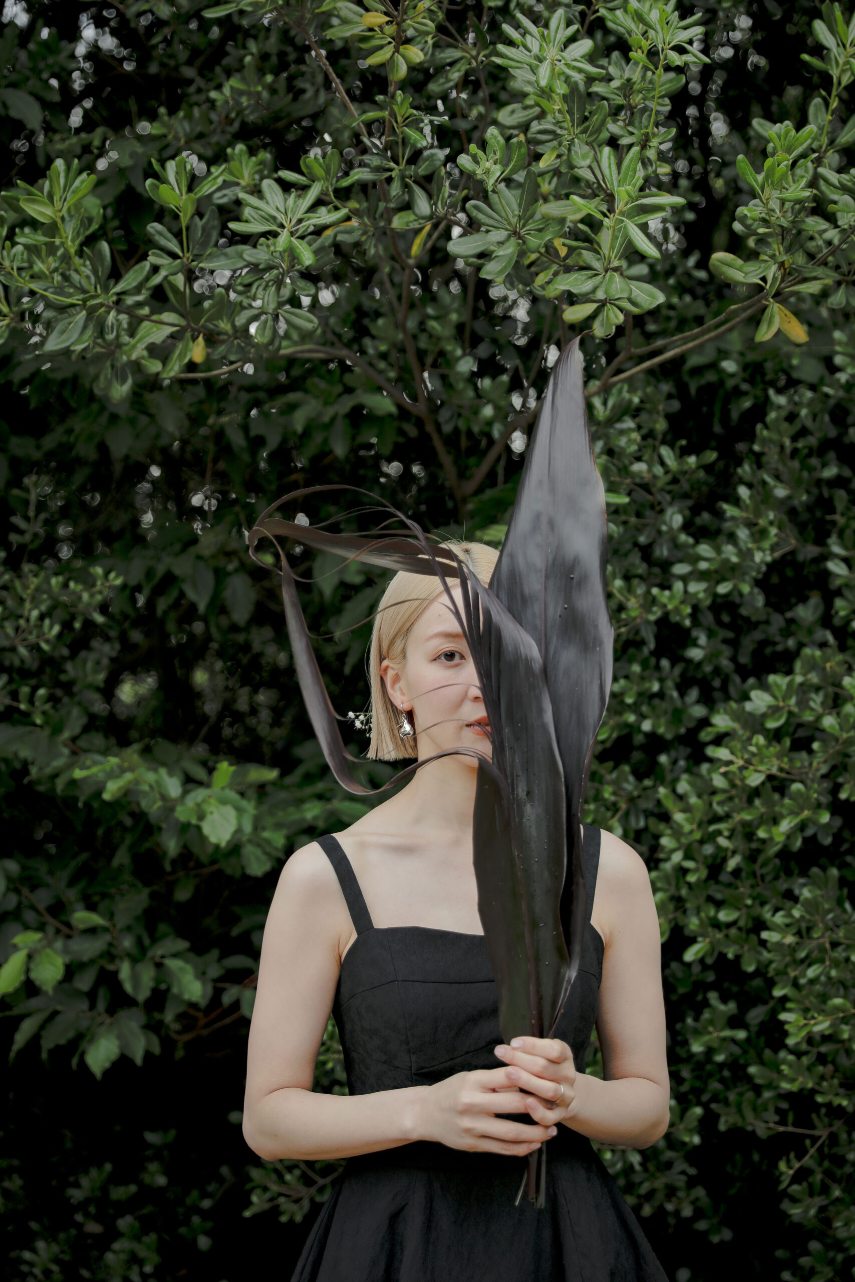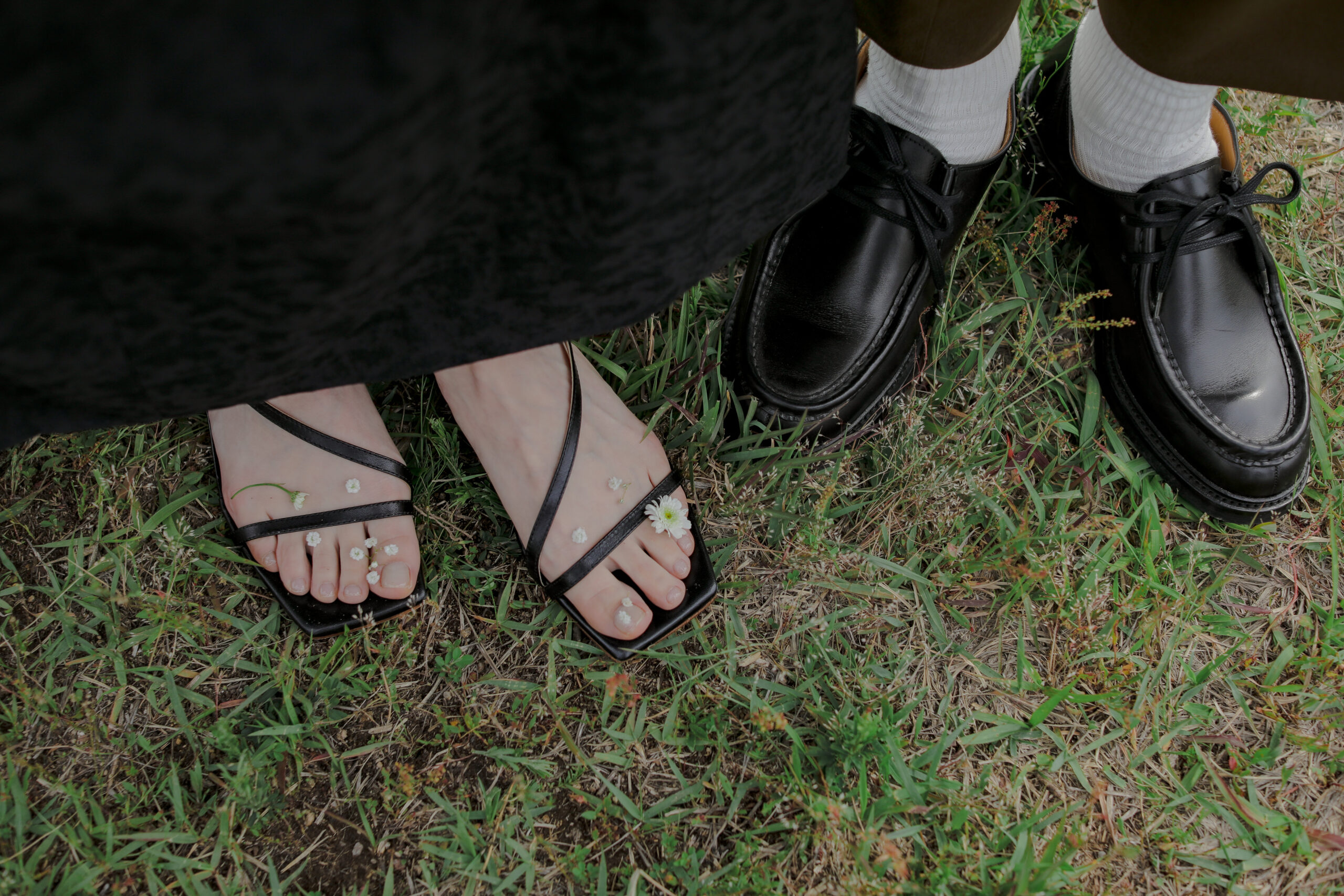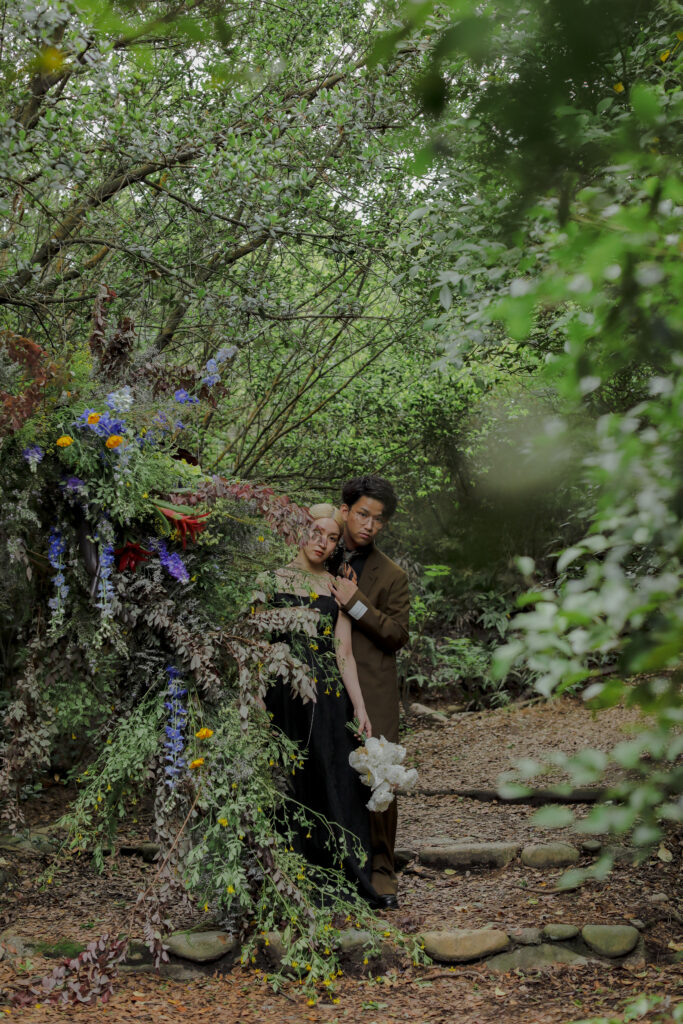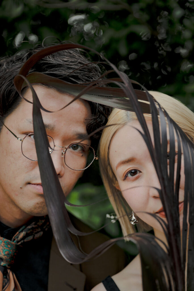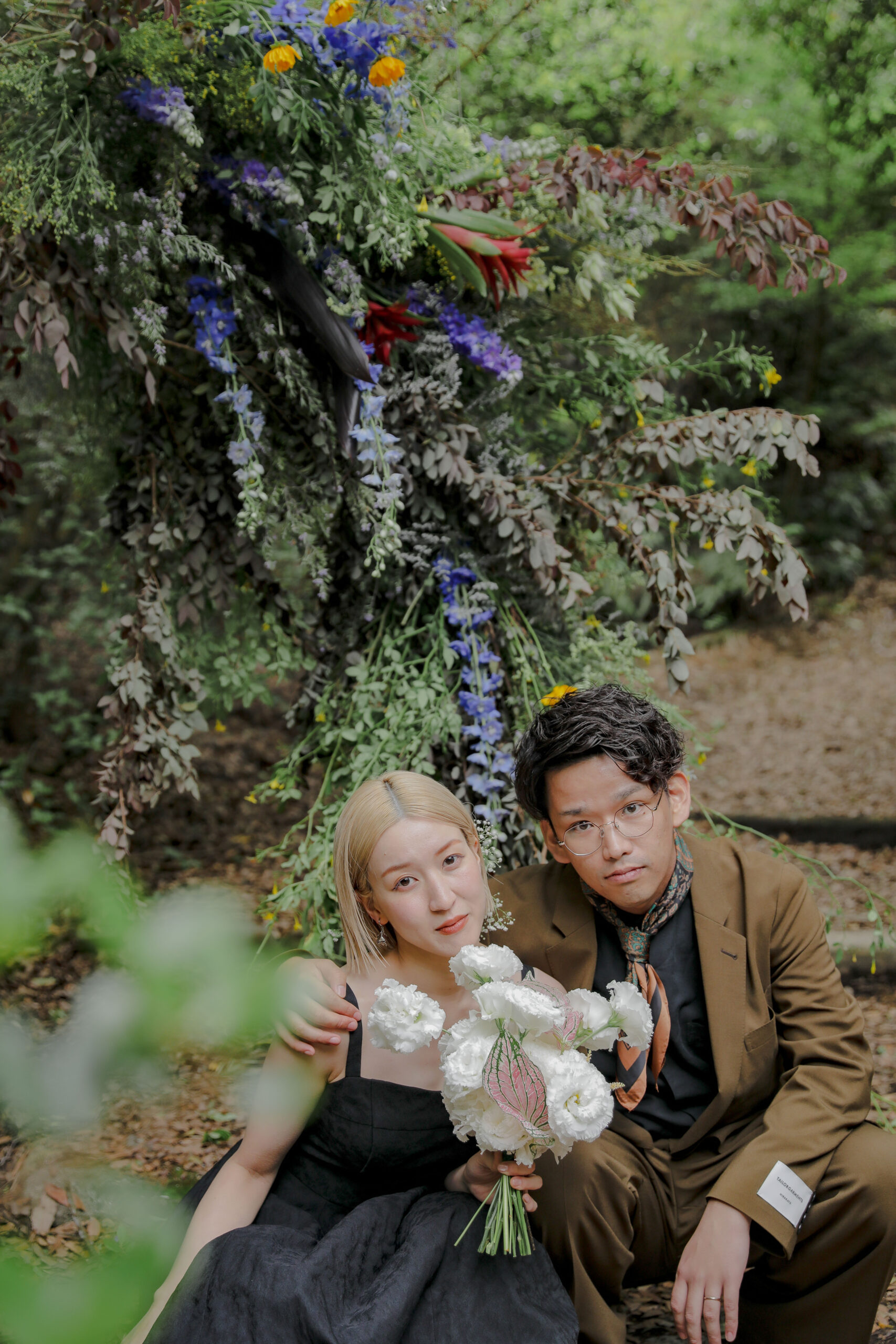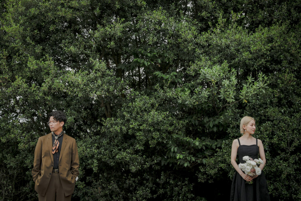 自然の緑と、色鮮やかな生花が織りなす空間は、おふたりの特別な時間をより一層美しく彩りました。一着目のドレスは、個性が光るクールなマントのウェディングドレス。新郎様のブラウンのジャケットとも相性が良く、洗練された大人の雰囲気を演出。二着目は、新婦様の美しいデコルテを際立たせるブラックドレスで、スカーフを巻いたりと個性的な表情を見せてくれました。