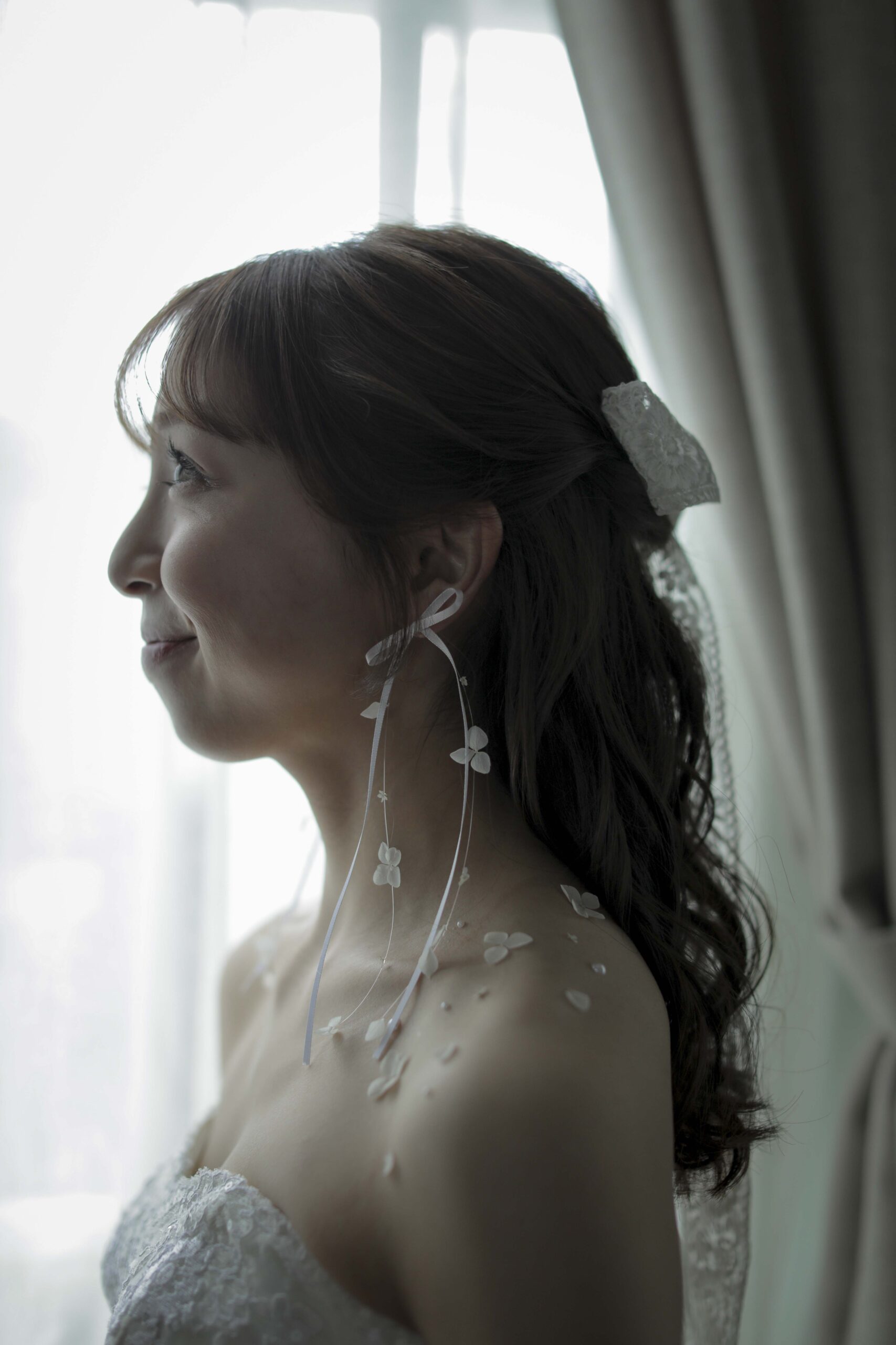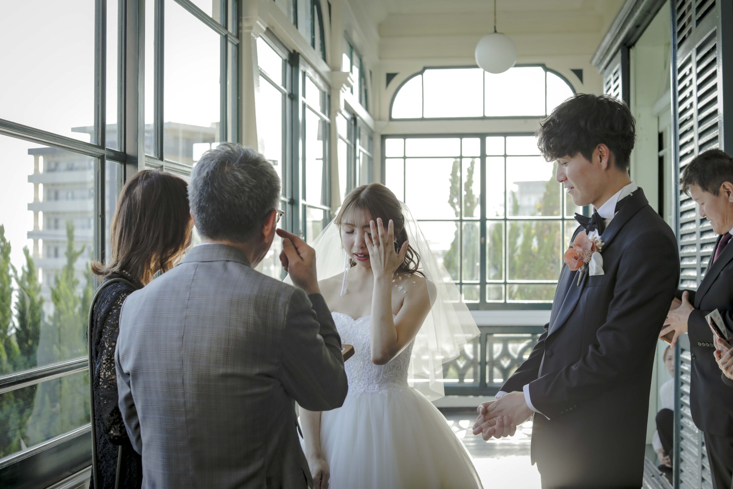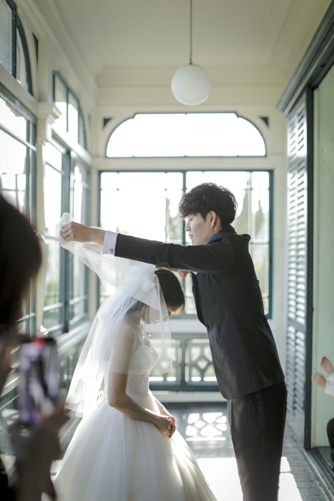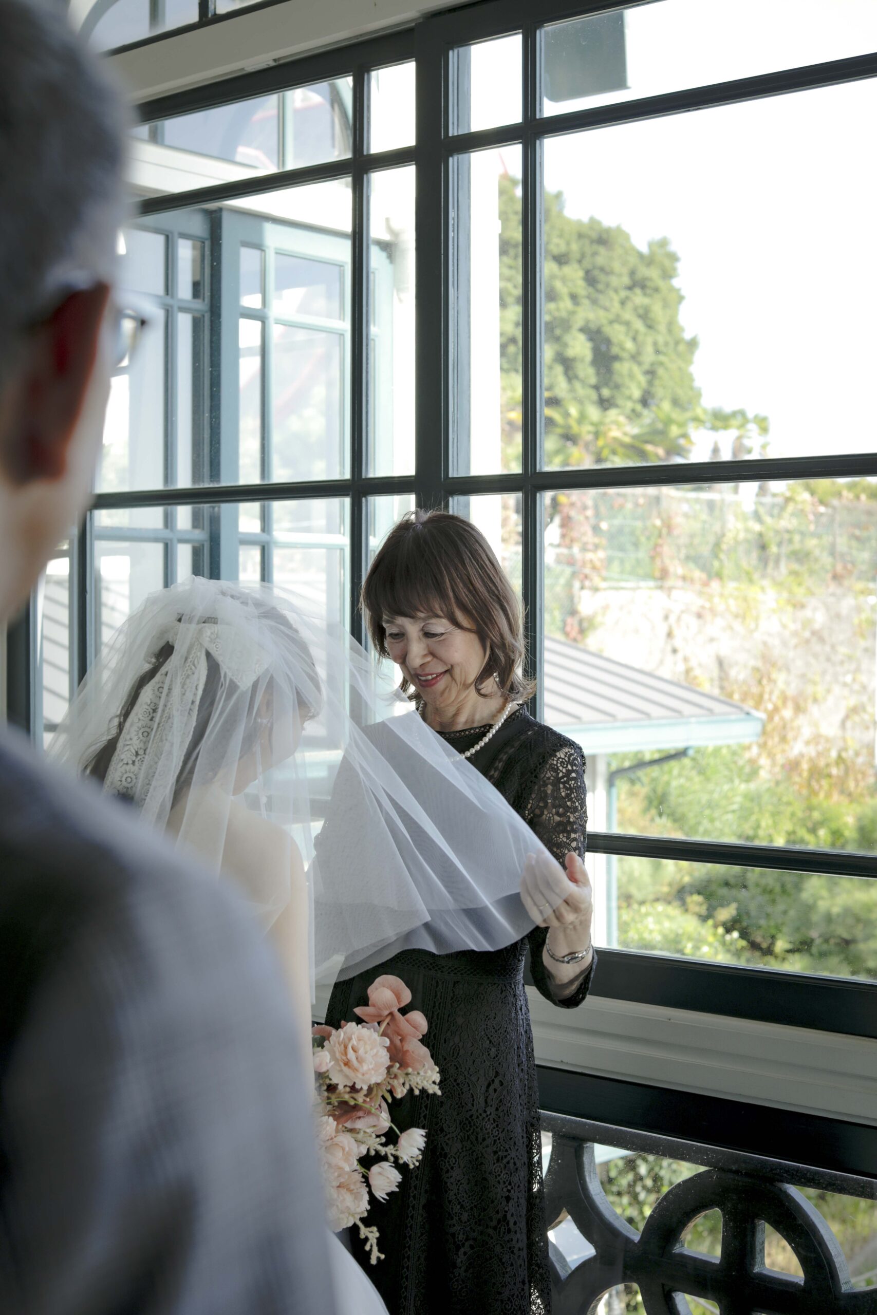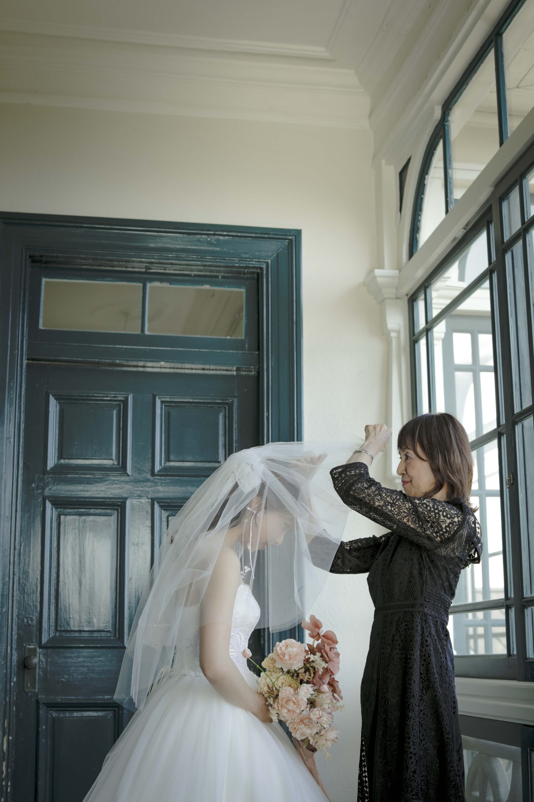 母からの「ベールダウン」と父との「入場」 撮影のハイライトは、実際の結婚式の次第を取り入れたセレモニーシーンです。 まずは母によるベールダウン。一歩踏み出す前の最後のお仕度として、母の優しい手でベールを下ろしてもらった瞬間、これまでの思い出が込み上げ、胸が熱くなりました。