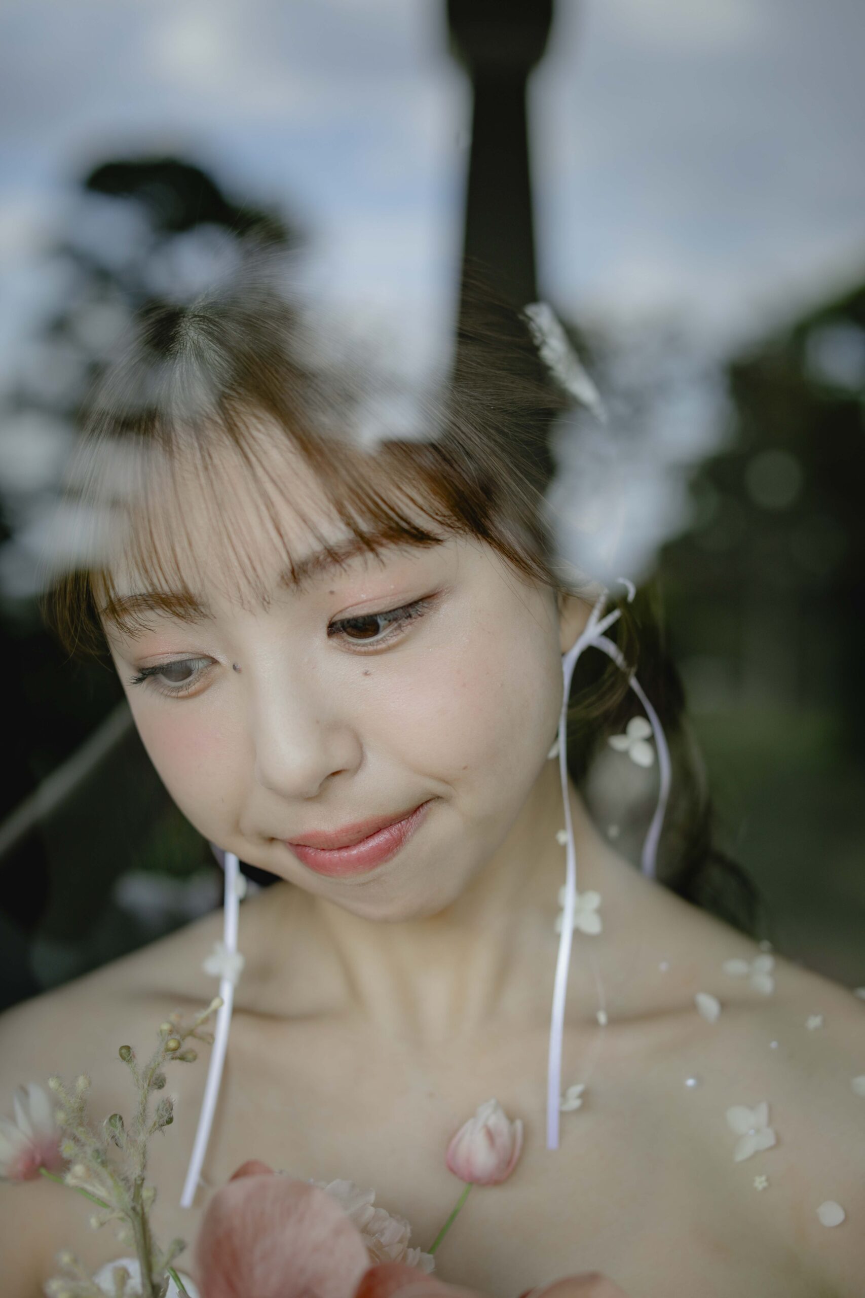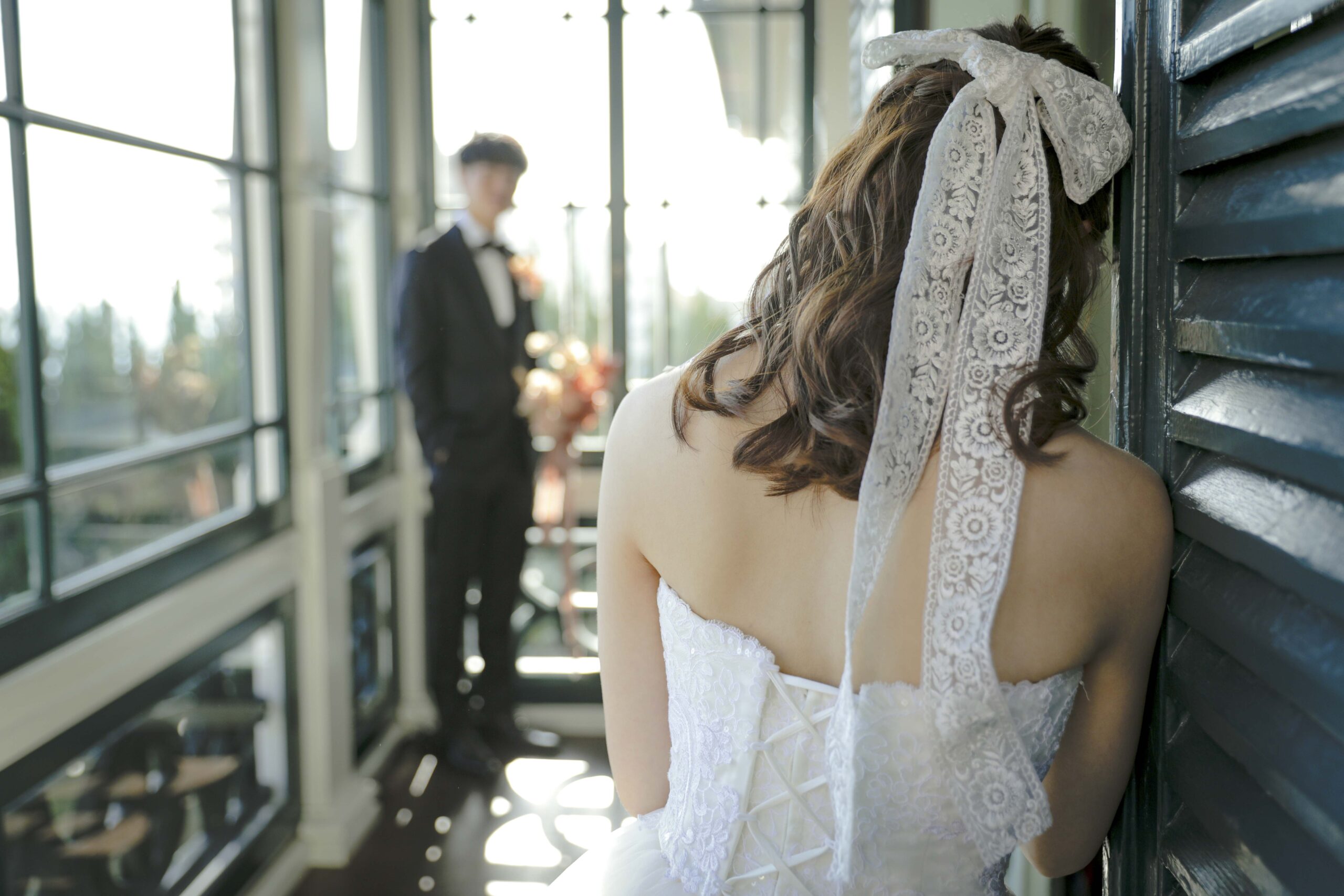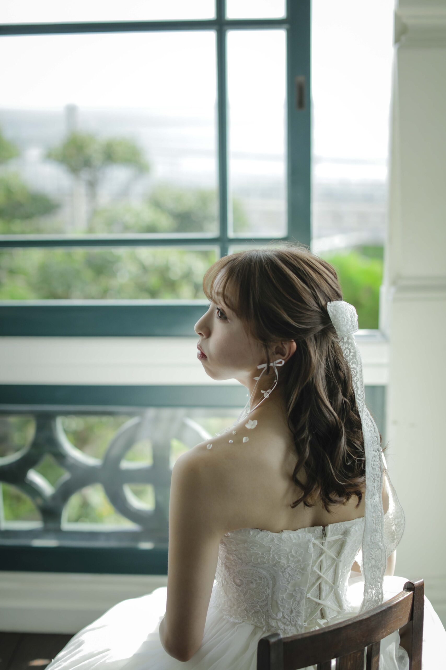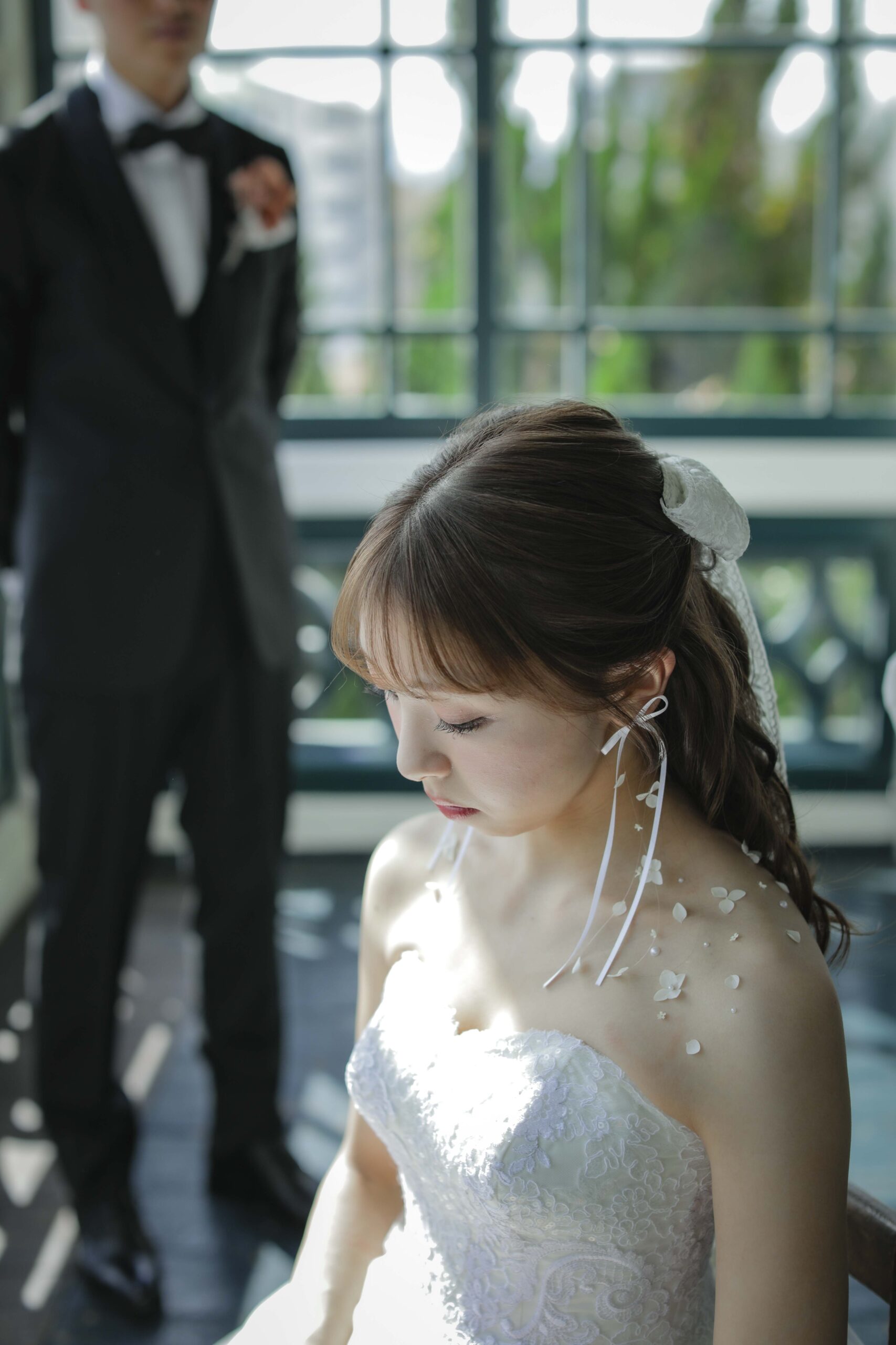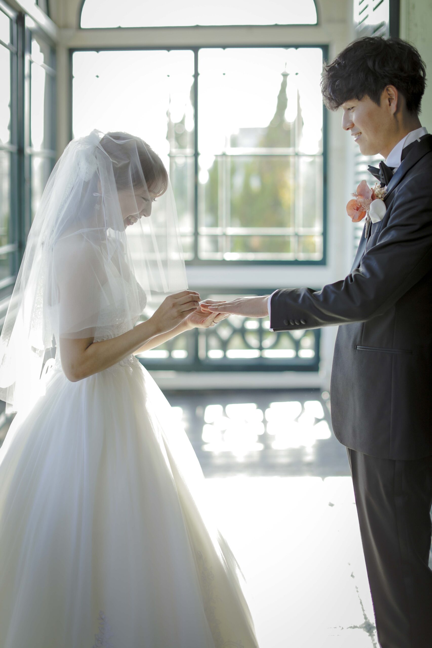 母からの「ベールダウン」と父との「入場」 撮影のハイライトは、実際の結婚式の次第を取り入れたセレモニーシーンです。 まずは母によるベールダウン。一歩踏み出す前の最後のお仕度として、母の優しい手でベールを下ろしてもらった瞬間、これまでの思い出が込み上げ、胸が熱くなりました。