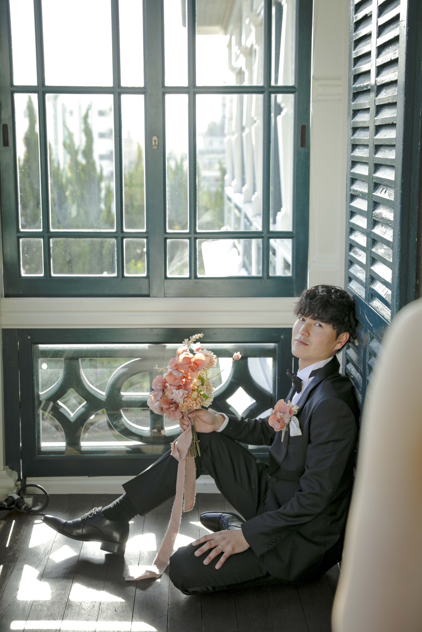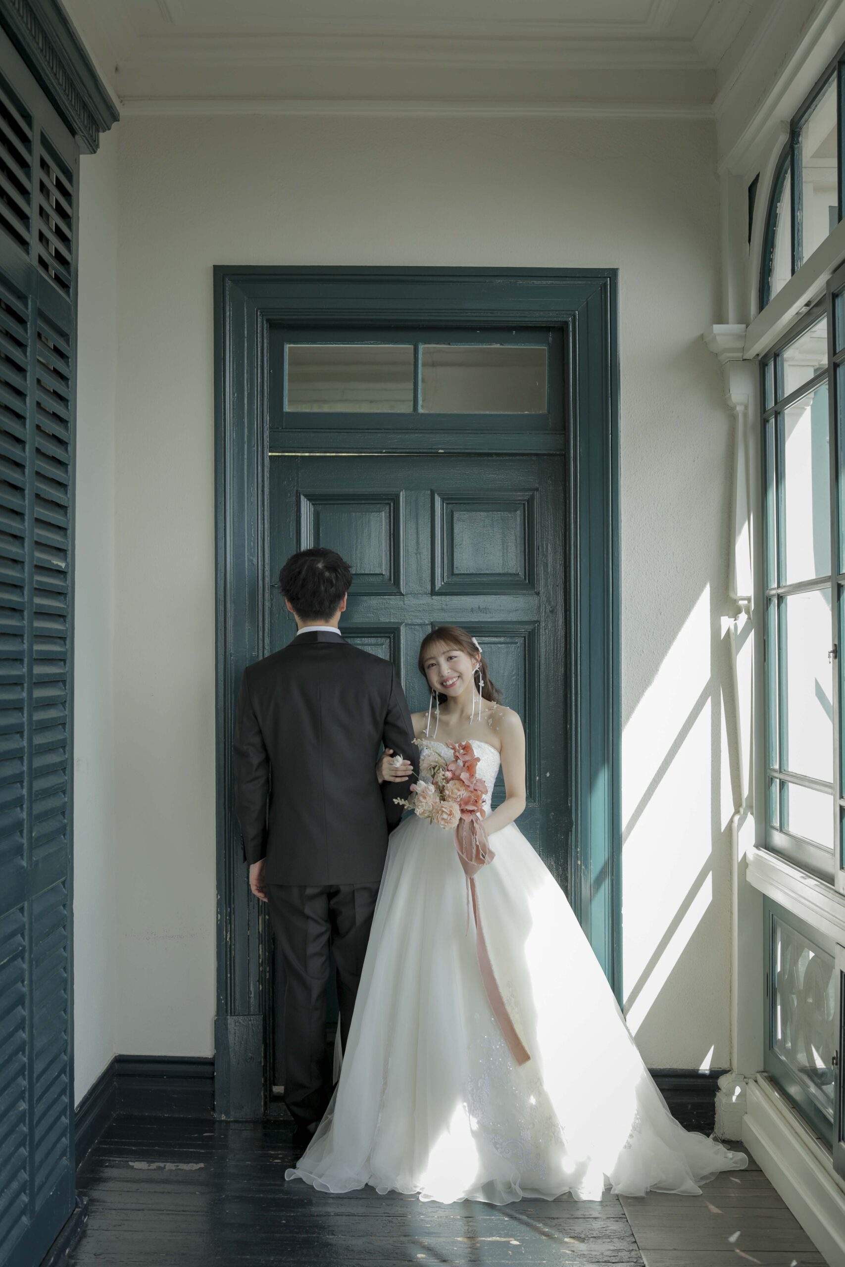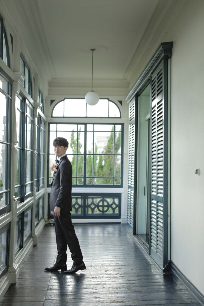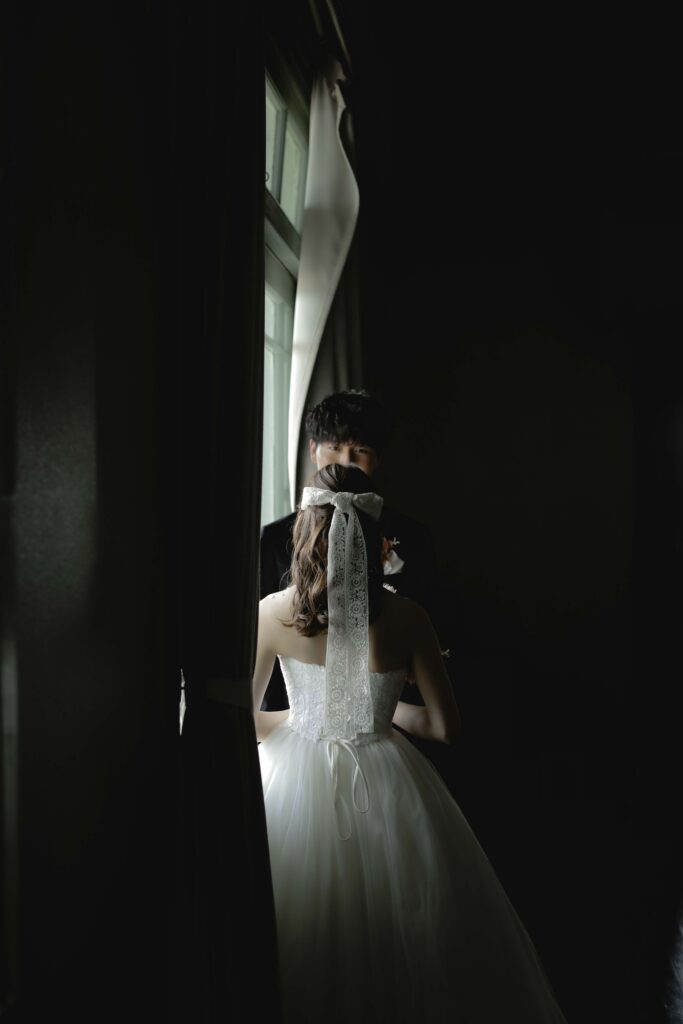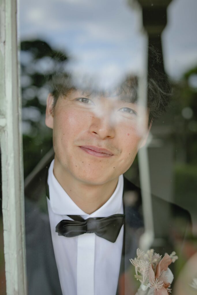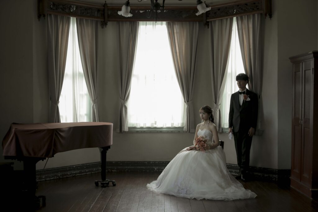 秋の光に包まれた最高のロケーション 旧グッゲンハイム邸を選んだ最大の理由は、どこを切り取っても絵になる圧倒的なロケーションの良さです。ミントグリーンの外観や、木の温もりを感じるクラシックな内装。特に秋の柔らかな陽光が差し込む窓辺は、映画のワンシーンのようなドラマチックな雰囲気を演出してくれました。