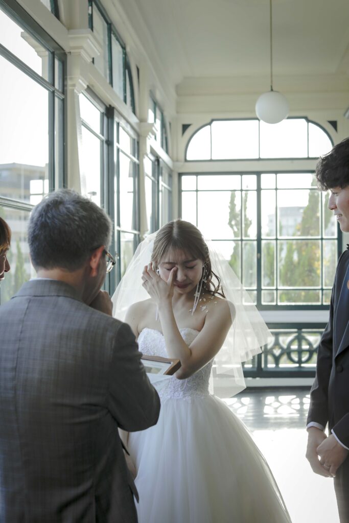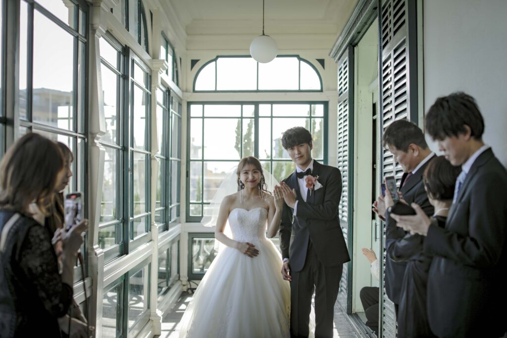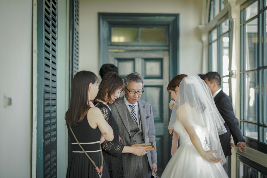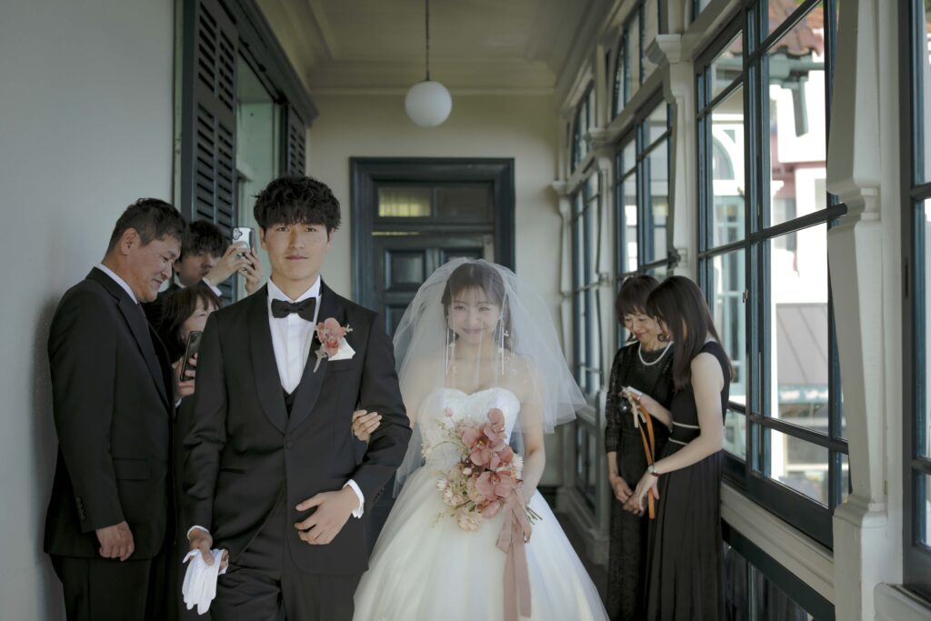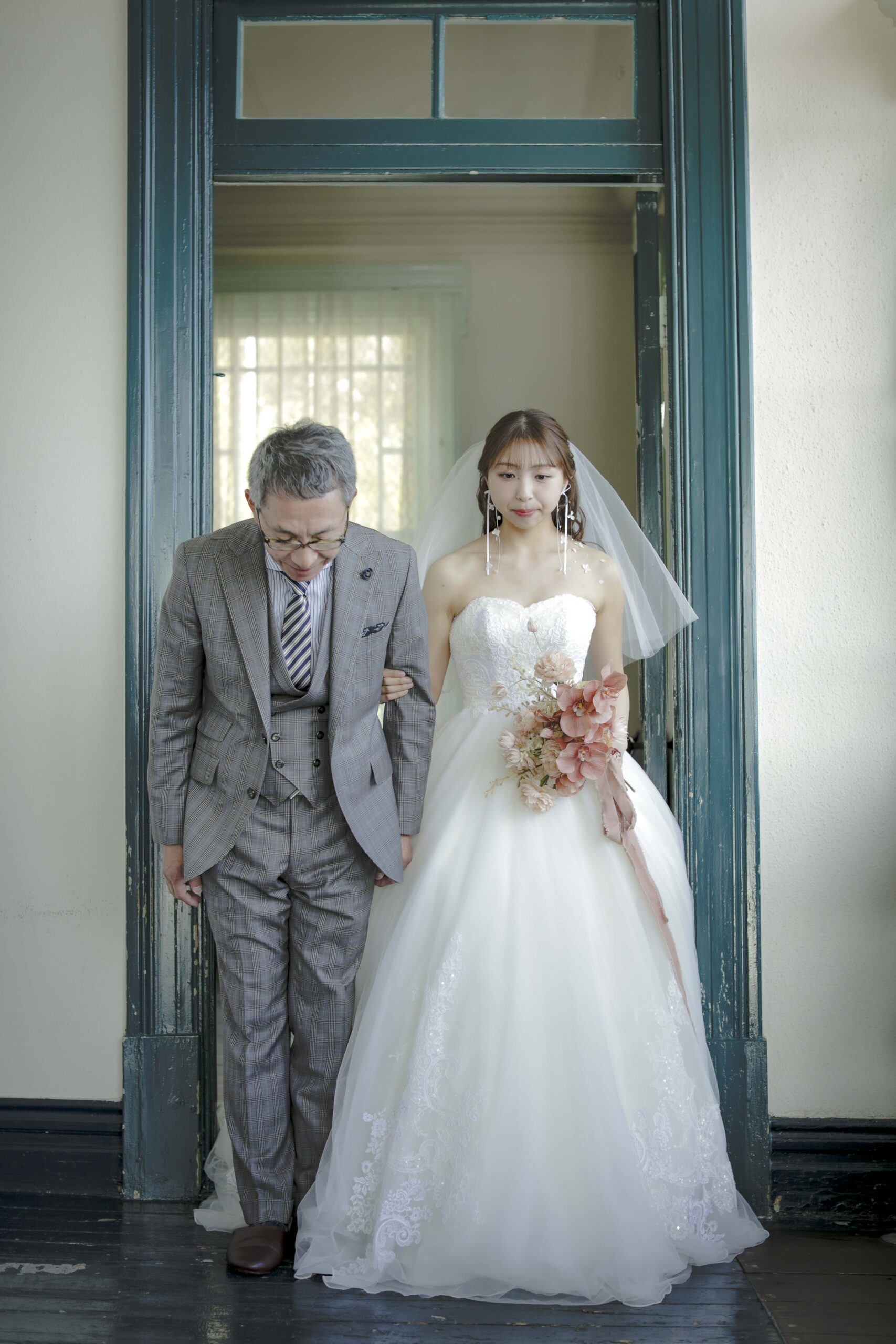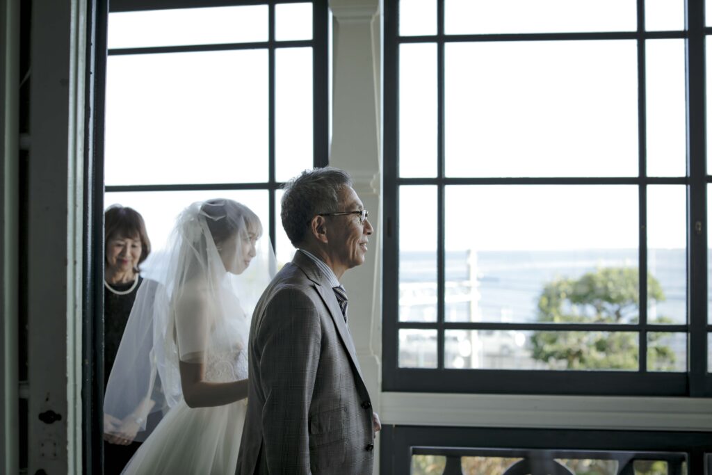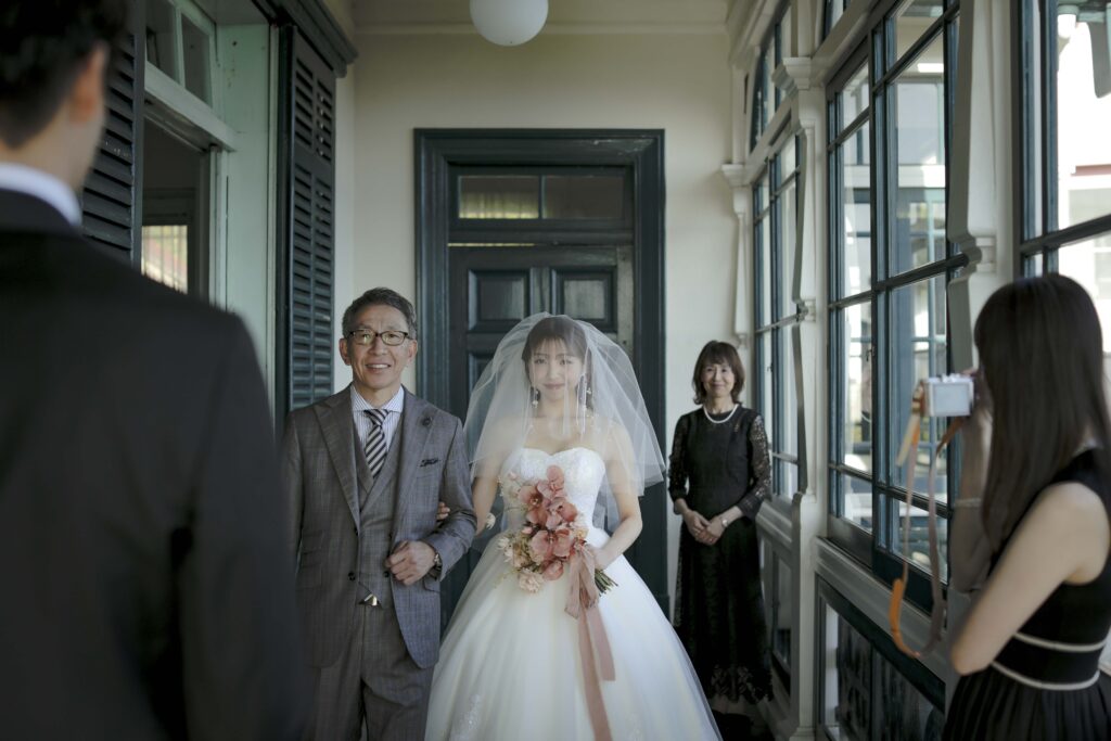 続いて、父との入場。歴史ある洋館の重厚な扉が開くと、そこには秋の光が差し込む美しい空間が広がっていました。父の腕に手を添え、ゆっくりと歩いた時間は、これまでの感謝を噛みしめる大切なひとときとなりました。