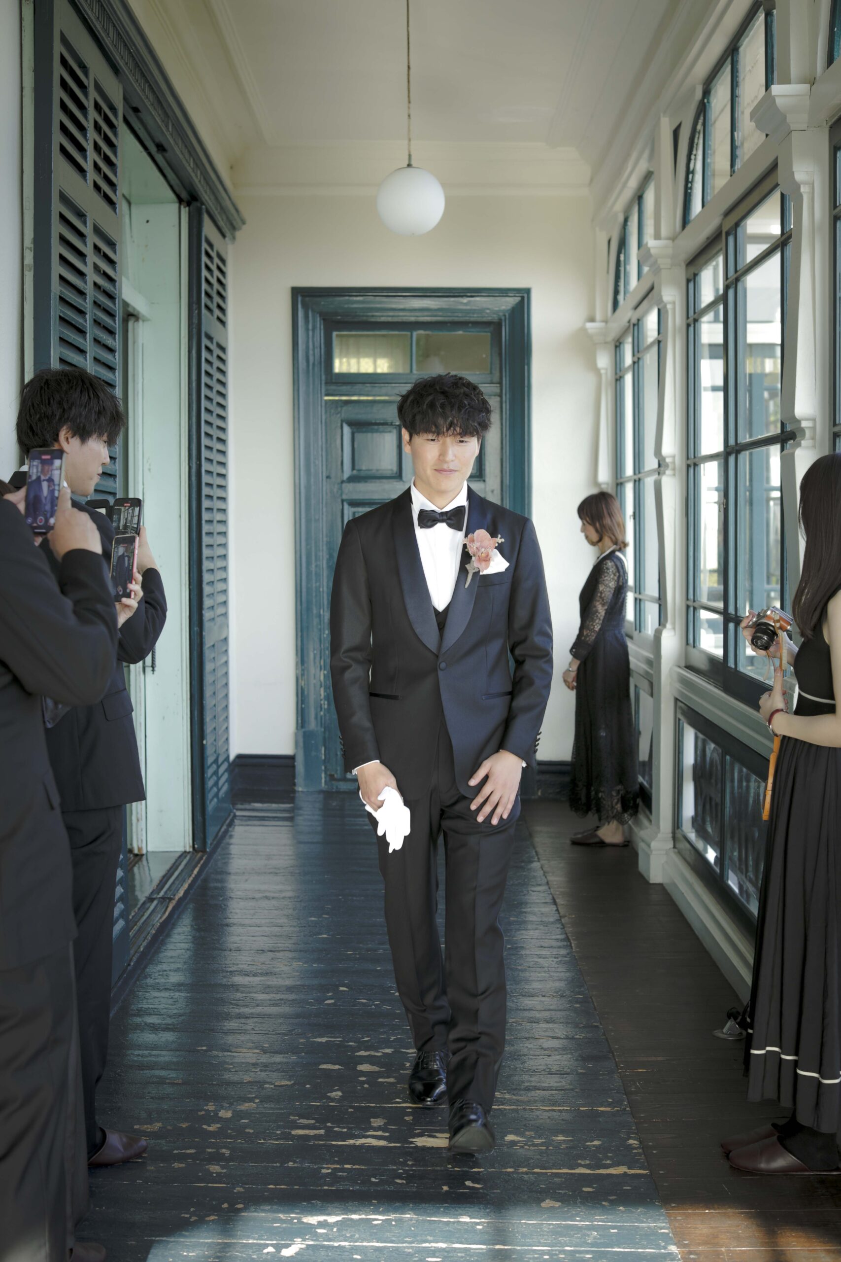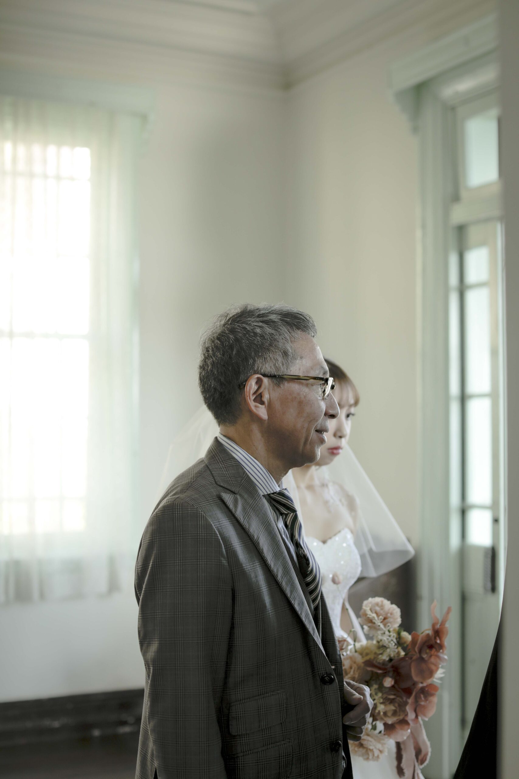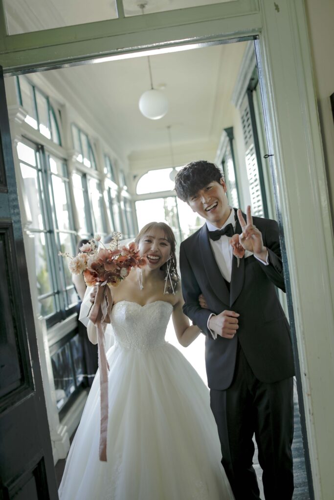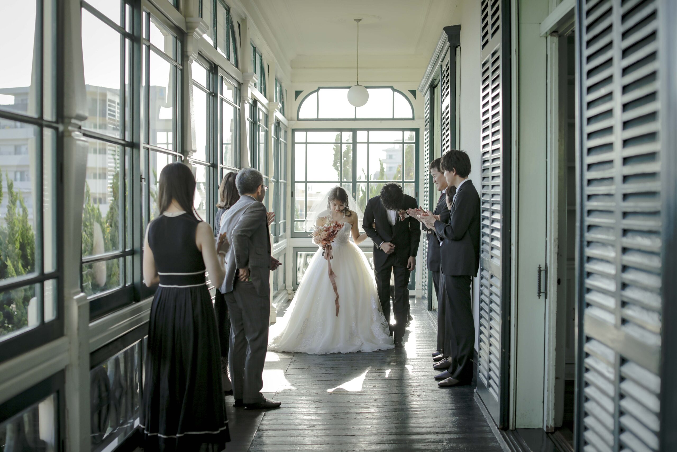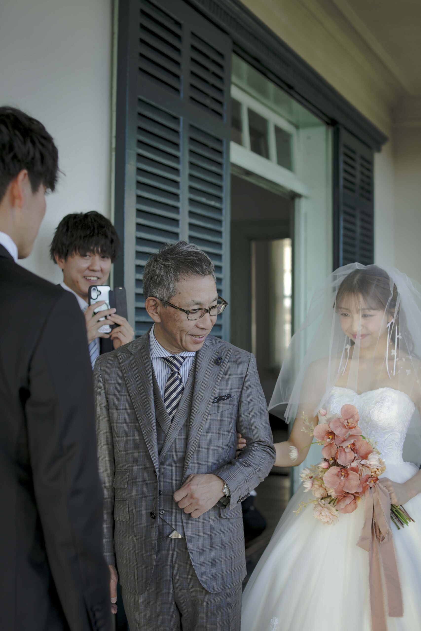 続いて、父との入場。歴史ある洋館の重厚な扉が開くと、そこには秋の光が差し込む美しい空間が広がっていました。父の腕に手を添え、ゆっくりと歩いた時間は、これまでの感謝を噛みしめる大切なひとときとなりました。