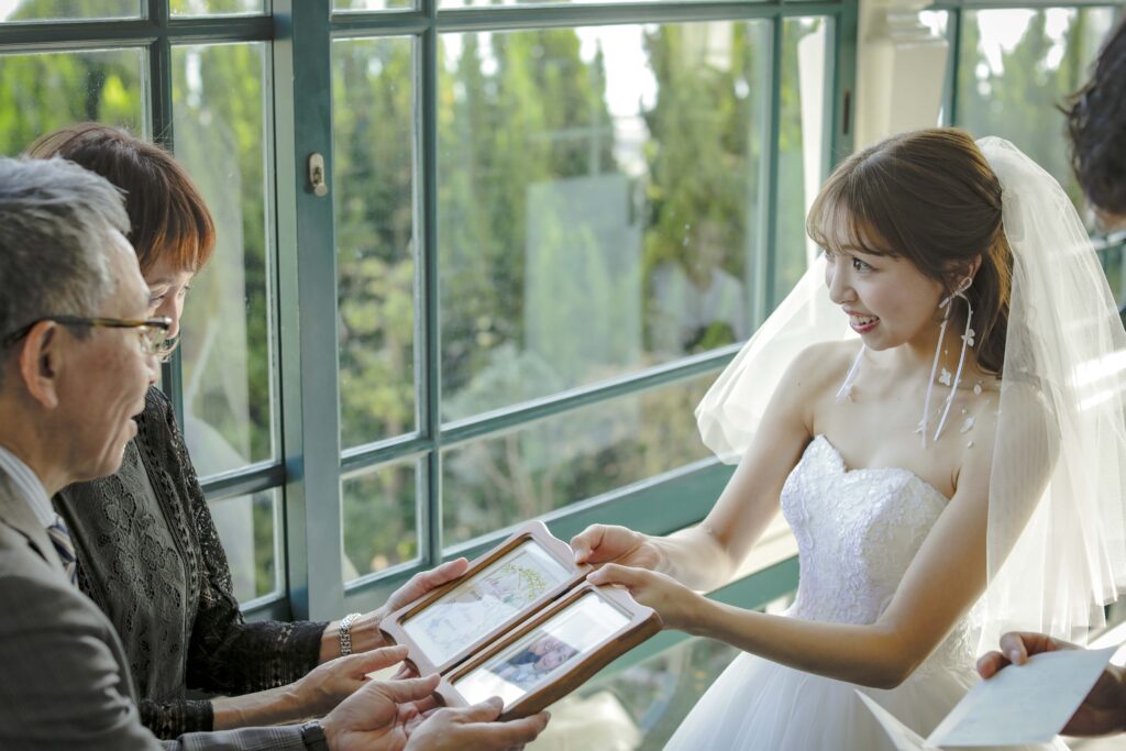 言葉にできない想いを込めた「贈呈」 セレモニーの締めくくりには、両親へ感謝の気持ちを込めたギフトを贈呈しました。 ブライダルの形式にとらわれすぎず、でもしっかりと想いを届けたい。そんな私たちのわがままを、この素晴らしいロケーションが叶えてくれました。