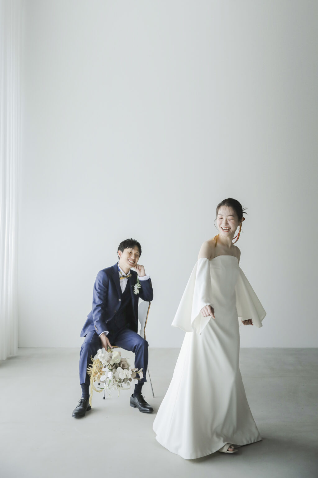 「派手なスタジオだと、背景に負けてしまいそうで……」 そう仰って来られたお客様が、INMYLIFEで撮影した写真の仕上がりを見て驚かれます。 「余計なものがないからこそ、お互いの表情がこんなに見えるようになるなんて」と。情報量が多い写真はインパクトこそありますが、主役であるはずの「ふたりの表情」や「関係性」が埋もれてしまいがちです。装飾を削ぎ落とした真っ白な空間は、いわばふたりのためだけの贅沢な余白。ごまかしが効かないからこそ、つないだ手の力加減や、ふとした瞬間の視線といった、「ふたりにしか出せない温度感」が鮮明に浮かび上がるのです。